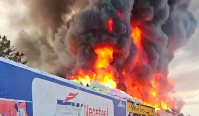 जयपुर। राजस्थान के बाड़मेर जिले में रविवार को कबाड़ के गोदाम में आग लग गई। आग इतनी भीषण लगी कि परिसर में धुएं का घना बादल दिखाई दे रहा था। शिव नगर रिहायशी इलाके में यह घटना हुई जिससे इलाके में अफरा-तफरी मच गई। पुलिस और दमकल की गाड़ियां मौके पर पहुंच गईं। आग पर काबू पाने के प्रयास जारी हैं। गोदाम मालिक भंवरलाल खोरवाल ने बताया कि रविवार सुबह कबाड़ के गोदाम में आग लग गई। कारण नहीं मालूम।