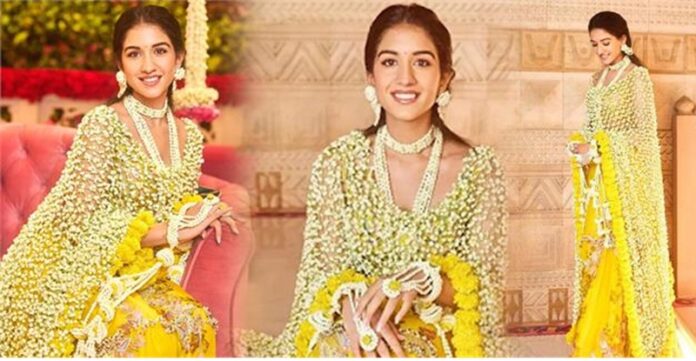 अपने हल्दी फंक्शन में अनंत अंबानी की होने वाली दुल्हन ने येलो लुक कैरी किया। उनके लुक की खास बात यह थी कि उन्होंने ड्रेस के साथ असली मोगरे और गेंदे के फूलों से बना हुआ दुपट्टा कैरी किया। इसके साथ उन्होंने खूबसूरत व्हाइट मोतियों वाली ज्वेलरी से लुक को कंप्लीट किया।