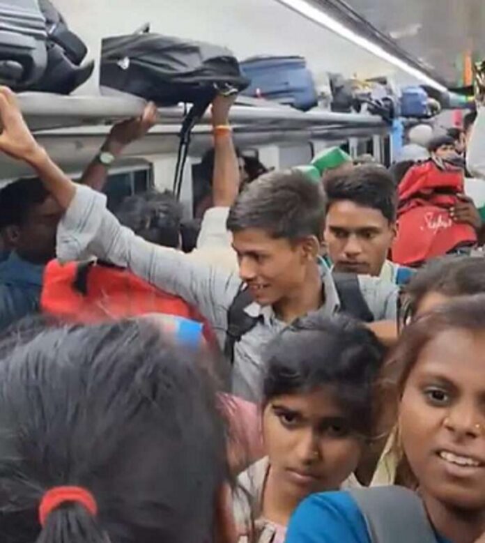 लखनऊ। वंदे भारत ट्रेनों में बिना टिकट यात्रियों द्वारा आरक्षित कोचों पर कब्जा करने की चिंताजनक प्रवृत्ति से भुगतान करने वाले यात्रियों में निराशा फैल रही है। अपनी बेहतरीन सेवा के लिए मशहूर वंदे भारत एक्सप्रेस को हाल ही में इसी तरह की दुर्दशा का सामना करना पड़ा, जब उसमें बिना टिकट यात्रियों की भीड़ उमड़ पड़ी। अर्चित नागर ने लखनऊ से देहरादून जा रही वंदे भारत एक्सप्रेस के कोच के अंदर की अफरा-तफरी को कैद करते हुए एक वीडियो शेयर किया। फुटेज में यात्रियों को गलियारों में कंधे से कंधा मिलाकर बैठा हुआ दिखाया गया है, जिससे उन्हें स्वतंत्र रूप से चलने-फिरने के लिए बहुत कम जगह मिल रही है।